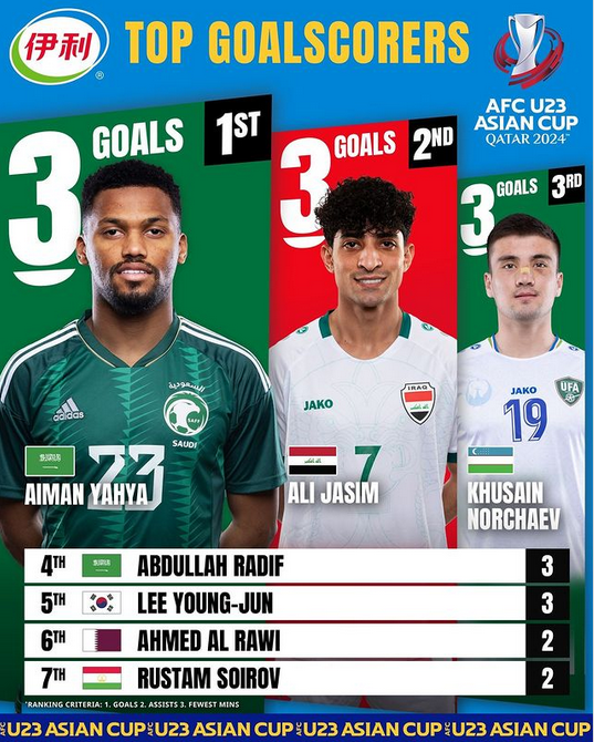 The race for the Yili Top Scorer award is too close to call with Iraq’s Ali Jasim and Husain Norchaev of Uzbekistan among five players on three goals. Crucially, the other three will not be in action with their teams having already exited the competition. Indonesia’s Komang Teguh, Rafael Struick and Marselino Ferdinan, Alisher Odilov of Uzbekistan and Japanese duo Mao Hosoya and Seiji Kimura are all on two goals.